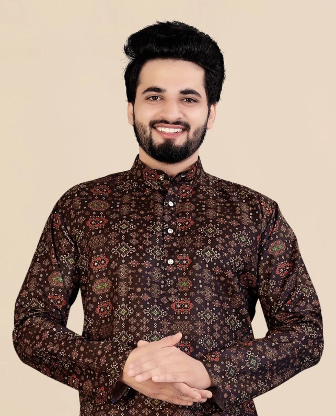 Brighten up your festive look with this kurta designed for men who love comfort with style. Made from soft, breathable fabric, it keeps you at ease throughout the day while the elegant print adds a touch of tradition and charm.